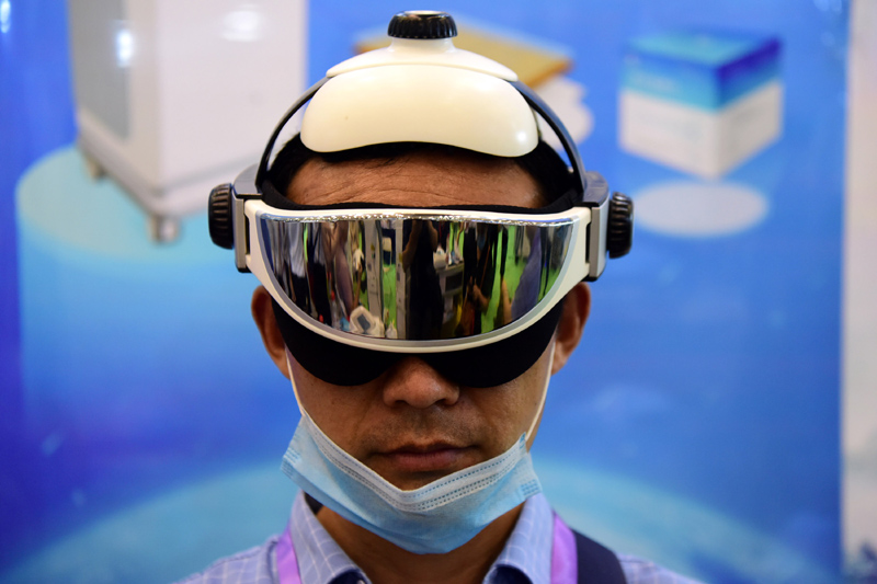 8月4日,参观者在中原医疗器械展览会上体验一款治疗仪。
