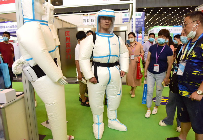 8月4日,参观者在中原医疗器械展览会上体验一款防护服。